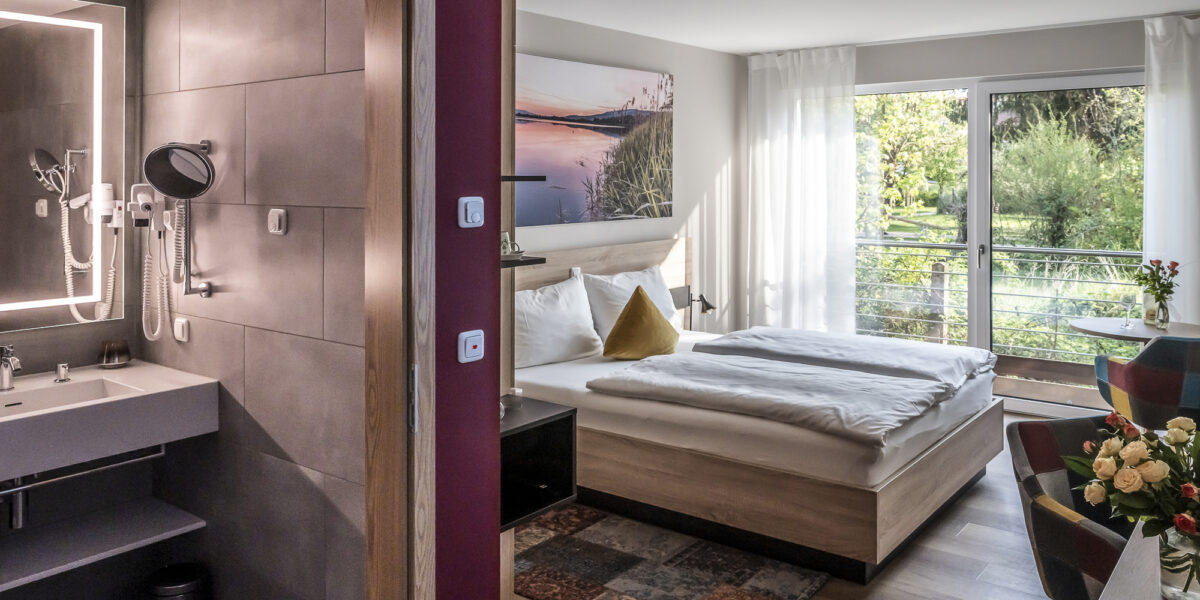 Jedes Zimmer ist natürlich mit einem gemütlichen Boxspringbett, Schreibtisch, Sitzgelegenheit und einem Badezimmer mit schwellenloser Dusche ausgestattet. Alle Zimmer sind barrierefrei und verfügen darüber hinaus über einen Balkon oder französischem Balkon mit Blick in den hoteleigenen Parkgarten oder zur Harlache, dem idyllischen Werra-Nebenarm.